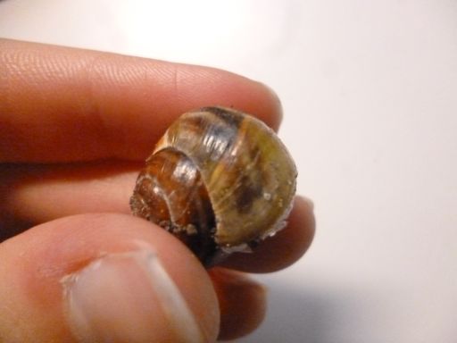 Ich habe mich dazu entschieden, mein noch leeres Terra mit Bänderschnecken zu besetzen. Heute habe ich auch das erste Exemplar gefunden, es hing an einem Weidenzaun. Auf den ersten Blick sah sie ganz normal aus, aber von der anderen Seite fiel mir auf, dass ein Teil ihres Häuschens grün ist. Etwa drei Viertel der äußersten Windung sind normal gewachsen, dann kommt ein etwas kruscheliger Teil und danach ist es irgendwie grün bis gelb, auch die Mündung ist so gefärbt. Ich hoffe, man kann das auf den Bildern erkennen.