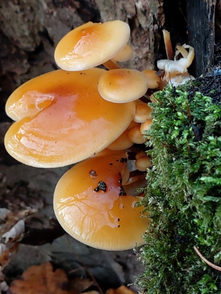 Pilzfressende Schnecken ( alle Nacktis stehen auf Pilze)stehen gerade mega auf den Samtfussrüblinge . Grössere Rüblinge scheinen allgemein beliebt). Samtfussrüblinge wachsen nur im Winter und haben einen orangegelben Hut, helle Lamellen und als Erkennungszeichen einen im unteren Bereich samtig braunen Stiel. An dem kann man ihn zb von Schwefelköpfen unterscheiden, die nicht gefressen werden.