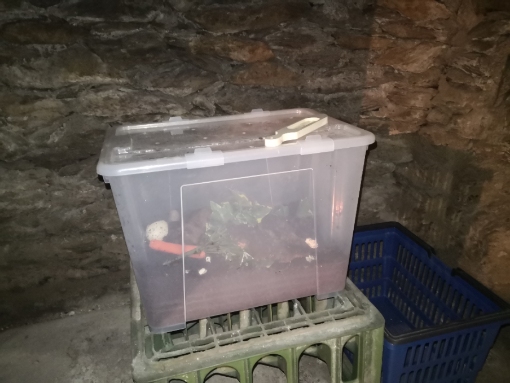 Dana ist in ihrer Transportbox im Keller untergebracht. Im Keller sind es 3°C.