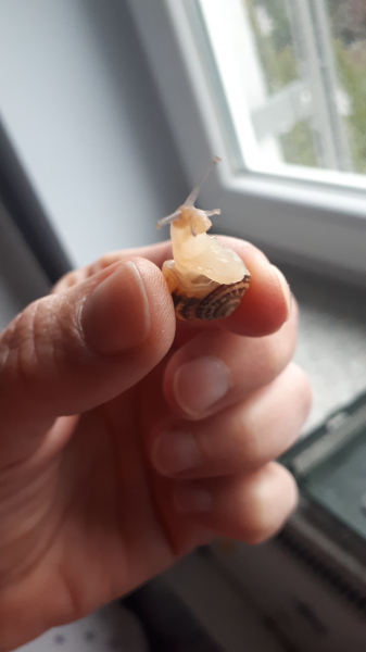 Heute habe ich beim Einkaufen auf einem Kohlrabiblatt eine einsame Schnecke im Supermarkt gesehen und hab es nicht über's Herz gebracht sie ihrem Schicksal zu überlassen...