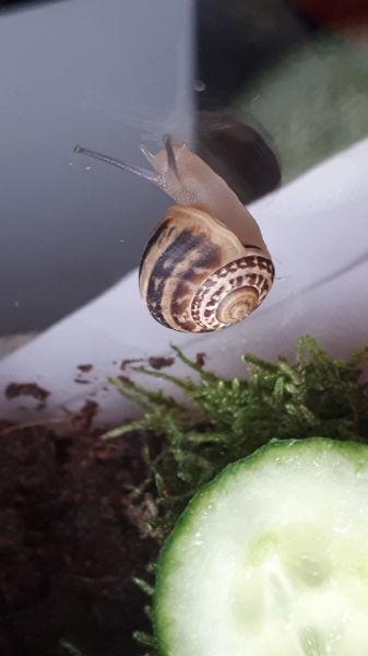 Nun wollte ich fragen ,ob uns jemand sagen kann, um welche Schneckenart es sich hierbei handelt. Sie ähnelt einer Bänderschnecke in meinen Laienaugen, aber hat eine auffällige Musterung am Haus.