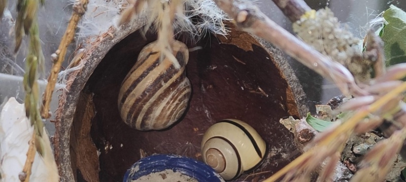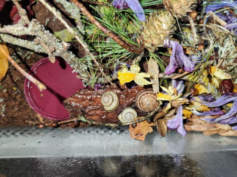 Trockenruhe hält meine Otala nicht, sie hat ja trotz Sommerhitze bei uns nicht dieselbe Dürre und Hitze wie im südspanischen Freiland in ihrem Terra. Im Winter begab sie sich mit den Bänderschnecken (Cepaea Nemoralis) in einen Winterschlaf.