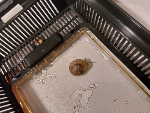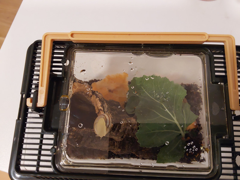 Vor ca. zwei Wochen hat mich bei einem Blick auf meinen Küchenfußboden fast der Schlag getroff3n. Da kroch eine winzige Schnecke lang ! Die Kleine hatte ein kaputtes Häuschen und hat sich die ersten drei Tage nachdem ich sie in eine Heimchenbox gesetzt habe gar nicht bewegt. Doch dann fing sie an zu fressen (vor allem Kohlrabieblätter) und Mann kann ihr beim Wachsen förmlich zusehen. Ich habe sie in eine Transportbox meiner Fulicas gesetzt und sie Macaronie getauft ( da ich denke es könnte eine Nudelschnecke sein).