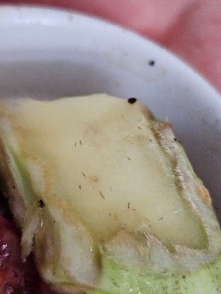 Durch die frischen Früchte und Gemüse, die wir den Schnecken verfüttern, finden sich trotz Fliegengitter immer wieder Fruchtfliegen im Terrarium. Auch Trauermücken haben es irgendwie geschafft, sich einzunisten. Ausserdem sind uns auf dem Gemüse winzig kleine Würmer aufgefallen, die dort umherwuseln. Wir konnten sie nicht bestimmen und haben Angst, dass es sich dabei um Nematoden handeln könnte, die den Schnecken schaden. Weiss hier jemand, was das für Würmer sein könnten?