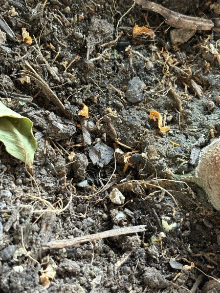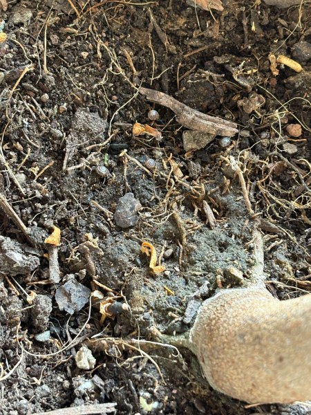 Man kann es wirklich kaum erkennen, aber es könnten Glanzschnecken sein? Für die wäre es auch typisch, sich da unten in der Erde rumzutreiben.