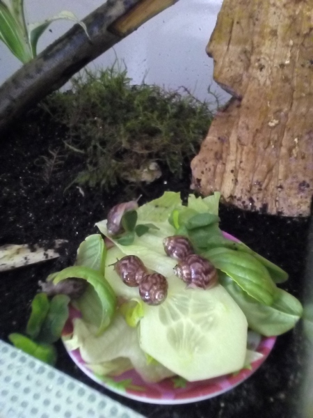 Den Schnecken geht es gut, esse mittlerweile alles was ihnen in die Quere kommt (selbst die Hand knabbern sie an)
