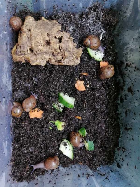 Seit 13. März haben wir (meine Tochter und ich) je eine 6er Gruppe Archachatina ventricosa (spectaculum?). Die waren als Achatina achatina im Geschäft angeschrieben. Nach Rücksprache meiner Tochter auf FB und mit mir haben wir beschlossen, das ganze Terrarium dort leer zu kaufen.
