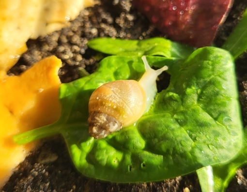 Emilia wächst leider im Moment gar nicht. Gestern habe ich gesehen, dass sie aber auch schon wieder Eier trägt. Wir hoffen, dass Babyschneck möglichst viel von Arwynn geerbt hat. Der wächst nach wie vor schön sauber vor sich hin.