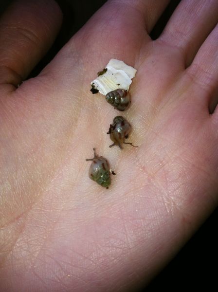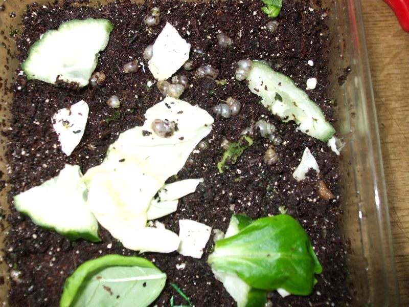 Nun hat eine der Schnecken letzte Woche Eier gelegt. Ich habe mir das mit der Taschenlampe von außen angesehen, dabei ist mir dann aufgefallen, dass ich schon kleine Schnecken habe!!!!!! Die Eier habe ich dann mit meiner Tochter entfernt (ich werde jetzt jede Woche das Becken kontrollieren), aber die kleinen habe ich in einer Heimchenbox mit gekalkter Erde, Sepiaschale usw. mit in das Becken gestellt. Meine Frage nun: Was mache ich damit?