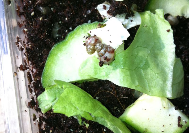 Ich habe die Schnecken in einem Terrarium, dass oben Lüftungsschlitze hat. Ich habe gedacht, wenn es nicht etwas belüftet ist, fängt die Erde bzw. die Kokosziegel evtl. an zu schimmeln durch die Feuchtigkeit. Morgen werde ich auch noch eine kleine Alu-Kuchenform besorgen und mit einer Lampe auf das Becken stellen. Dann haben die Schneckchen es auch wärmer, hoffe ich.