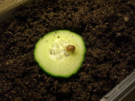 Viel kann ich euch aber im Moment nicht bieten, außer einer Aufnahme von den Eiern selbst. Wie man sieht, befinden sie sich im Substrat eingebettet in einer üblichen 1l-Box. Die Box ist nicht verschlossen, aber dennoch gesichert: Am oberen Rand der Box klebt ein starker Klettstreifen (von Tesa, hier überlasse ich nichts dem Zufall), der lückenlos ein straff gespanntes Gazenetz hält. Die Box steht im Terrarium der großen Schnecken, denn das Aquarium ist noch nicht fertig. Leider halten sich die Schnecken frecherweise nie an meine Zeitpläne... Allerdings kriechen die großen Schnecken bislang nicht darüber.