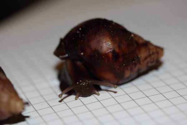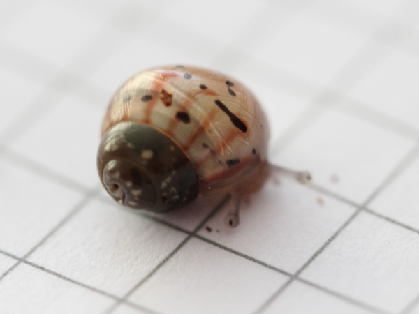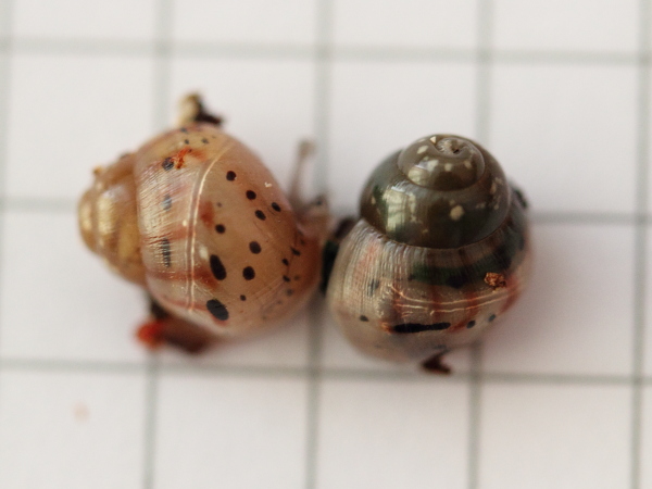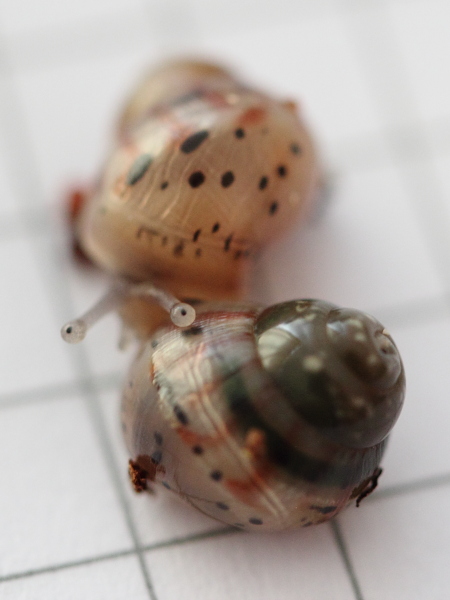 Nun, nach ca 14 Tagen, sind die zwei Kleinen zum Vorschein gekommen. Wie weiße Johannisbeeren, ganz durchscheinend und wenn man genau hinsieht, puckert es unter dem Häuschen. Ein Paar Batzelaugen habe ich auch schon gesehen.