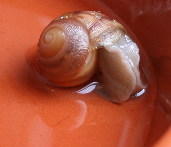 Nicht nur ihr Äußeres ist seltsam, auch ihr ganzes Verhalten. Ich hab sie heute 2 Stunden beobachtet, wie sie aus ihrem Häuschen kommt und hab echt mit dem Kopf geschüttelt. Normalerweise liegt doch so ein Schneck mit der Mündung nach unten da. Dann hebt sich irgendwann das Häuschen leicht, der Fuß schaut raus und schwupps ist das Köpfchen da.