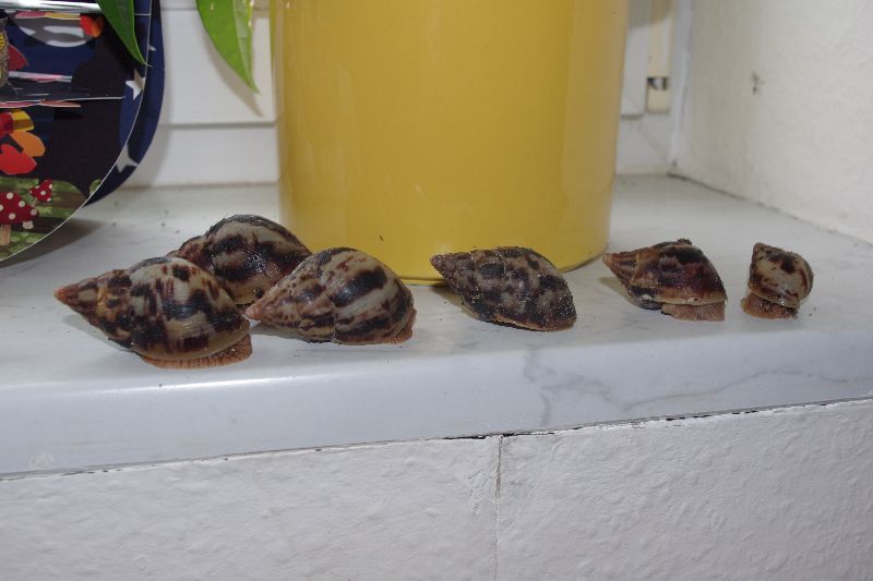 Hier sind die aktuellen Fotos der Truppe - ein paar waren noch verbuddelt. Und eine macht mir Sorgen wegen ihrem Gehäuse. Ganz seltsam, es sieht so aus, als würden sich die anderen an ihrem Gehäuse bedienen und es abnagen (brrr...