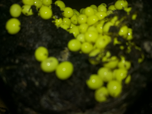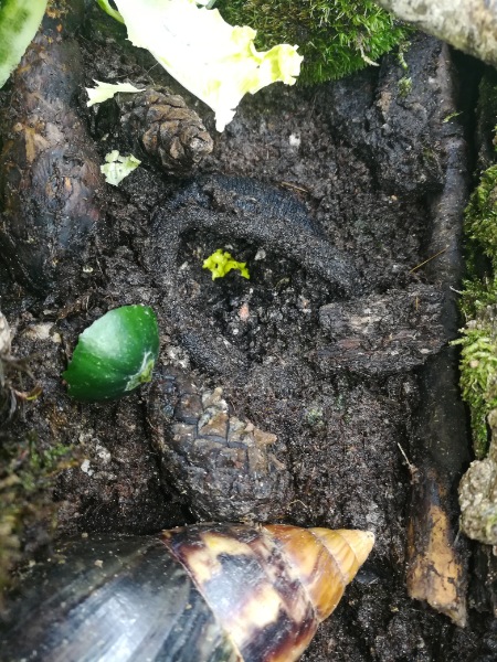 Und es ist eingegraben. Außer dem ist aus dem ersten nichts geschlüpft. Es scheint mir auch so, dass das zweite Gelege aus größeren Eiern besteht. Die alten Eier glitzern nicht mehr und sind eher matt. Ich sehe auch keine Entwicklung.