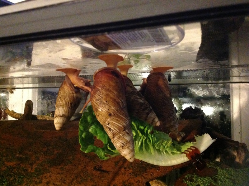 Wie nett das auf dem ersten und zweiten Bild ist. Wie du das Salatblatt festgeklemmt hast, damit das Schneckchen auch genüsslich von der Decke hängend raspeln kann :lol:
