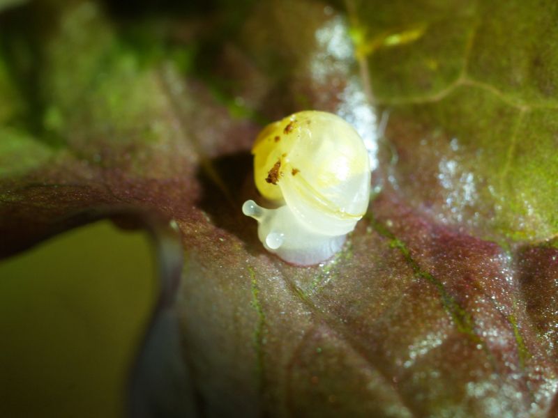 Alle anderen Eier waren leer.Nun habe ich also ein Einzelschneckenkind in einer Salatdose sitzen. Leben tut es offensichtlich, immerhin ist der Körper mal im Haus, mal draußen. Bewegung habe ich noch nicht feststellen können. Ihre Eierschale hat sie ebenso wie ganz fein gebröselte Sepia und ein Salatblatt dabei.