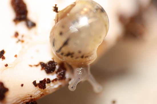 Hab sie erst zu den anderen Minis gesetzt, aber im direkten Vergleich sah sie noch komischer aus...Die wächst doch nicht spitzig, sondern rund oder irre ich mich da? Ich weiß, dass man so kleine Schnecken kaum bestimmen kann. Die Lütte ist auch bloß 2 Millimeter groß. Ich hab das Lupenobjektiv genommen, mit dem die Augen von jungen Limis so aussehen:
