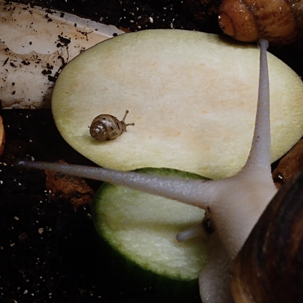 Eben entdecke ich eine Babyschnecke, die für mich aussieht wie eine kleine Fulica. Das Problem dabei ist nur, dass sie im Terrarium meine Sutus aufgetaucht ist!