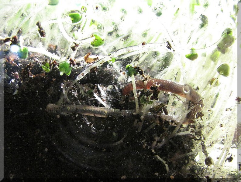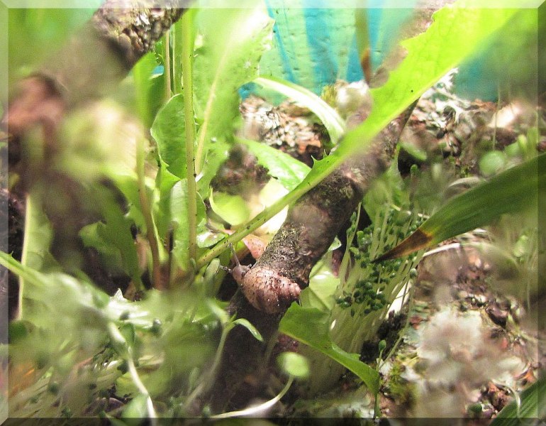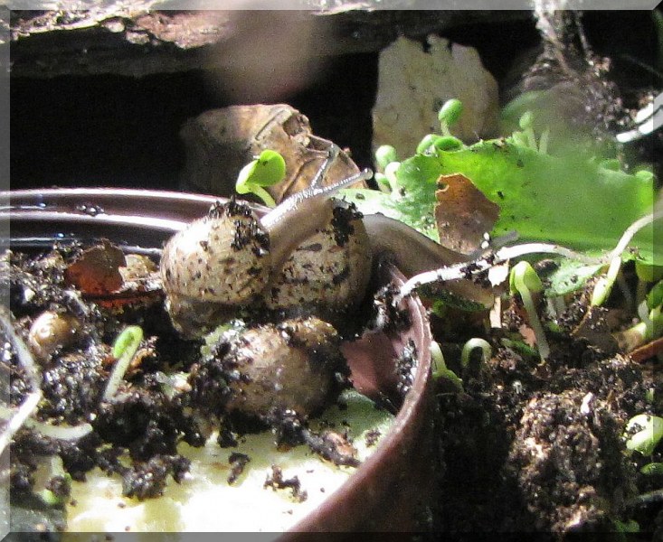 Das Terra, in dem meine Kleinen wohnen, hast du ja auf dem Bild gesehen. Da sprießt die Saat von Chia- und Leinsamen, ein wahrer Dschungel mittlerweile und das macht es mir gar nicht so leicht, die kleinen Schnecken aufzuspüren (mit den Augen). Aber gestern hatte ich wieder 7 von ihnen herumturnen sehen. So süß