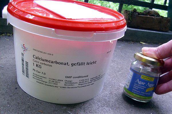 100 ml Wasser werden also mit 1/4 Teelöffel Agar-Agar verrührt und 5 Minuten gekocht; dabei verschwindet der leicht fischige Geruch, der anfangs entsteht. Nach etwas Abkühlung wird die Agar-Agar-Lösung in eine Form gegossen und mit soviel Calciumcarbonat verrührt, dass der Brei eine gipsartige Konsistenz bekommt.