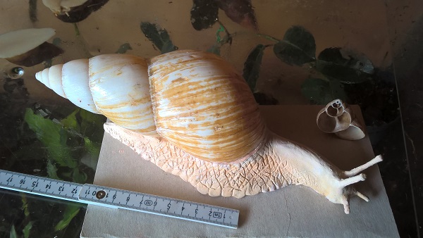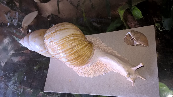 ich hab für einen Schneckenvortrag aus lufttrocknender Modelliermasse das Modell einer Achatina fulica gebastelt. Das Gehäuse hatte ich noch von meiner ersten VA. Es ist mittlerweile etwas verwittert, so daß die ursprüngliche gelbe Farbe großenteils fehlt. Mit der Körperfarbe bin ich noch nicht ganz zufrieden. Auf der Modelliermasse kommt das Cremeweiß einfach immer rosa raus. Aber ein zweiter Anstrich müsste das beheben.