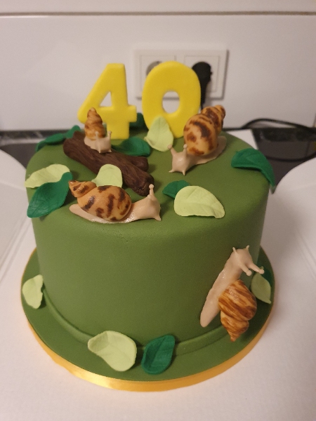 Die Schnecken und die andere Deko ist aus Fondant (Zuckermasse).