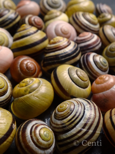 Ich habe mir im Laufe des Jahres eine kleine Sammlung an Hain- und Gartenbänderschneckenhäusern zugelegt, weil ich die Vielfalt der Farbvarianten so toll finde. Und weil es mir schwerfällt, einen so schönen Gegenstand wie ein guterhaltenes Häuschen einfach draußen liegen zu lassen. Ich bin eine Sammlernatur.