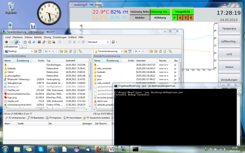 Die Simulation von Sonnenauf- und -untergängen habe ich jetzt auch fertig eingebaut, das ganze befindet sich aber noch in der Testphase. Momentan steht die Kühlung auf dem Programm, die zwar schon programmiert ist, für die aber noch keine Steckdose im Terrarienschrank ist. Da muss ich aber nur zwei Kabel anschließen.