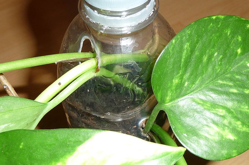 Ganz unten habe ich Löcher in die Flasche gemacht. Als Drainageschicht habe ich zuerst etwas Kies eingefüllt. Oben sind zwei größere Löcher für die Ableger, die ich mit einem Feuerzeug etwas angeschmort habe, damit die Ranken nicht an scharfen Kanten reiben. Mit einem Trichter Blumenerde eingefüllt, dann reichlich gewässert, dabei legt sich die Erde dicht um die Planzenstengel. Im Flaschendeckel ist ebenfalls noch ein Loch zur Belüftung.