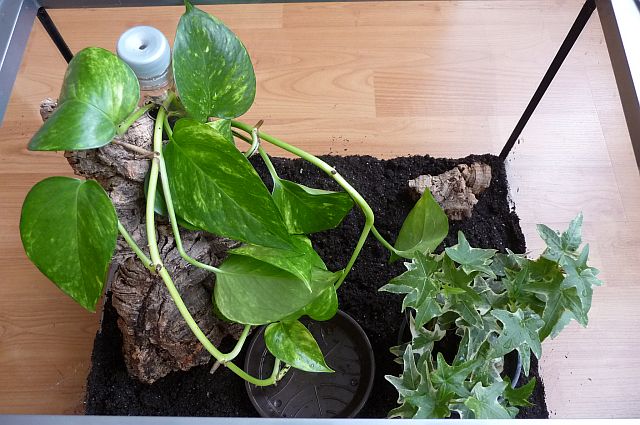 Im Terrarium habe dich die Pflanzflasche etwas hinter einer Korkplatte versteckt, über die die Pflanze nun dekorativ herabranken kann:
