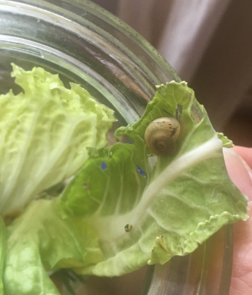 Vor etwa einer Woche fiel eine klitzekleine Schnecke aus meinem Salat. Aufgrund der aktuellen Temperaturen habe ich mich hier ein wenig umgeschaut und ihr vorerst ein großes Glas mit Blättern, Zweigen, Futter, einer „Bademuschel“ und zerkleinerten Eierschalen eingerichtet.