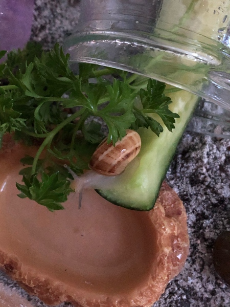 Momentan lebt sie in einem Einmachglas (Deckel natürlich nicht verschlossen, und regelmäßig befeuchtet) Ich füttere sie mit Gurkenscheiben. Aber das soll sich so bald wie möglich verbessern.