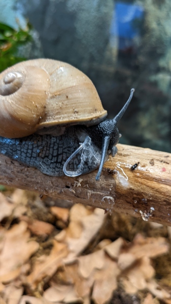heute morgen bin ich aufgestanden und habe eine meiner Schnecken gefunden mit ziemlich viel Schleim (?) am Hals. Eine andere Schnecke ist gerade aus der Ecke weg gekrochen. Als Neulinge sind wir jetzt unsicher. Haben sich die beiden einfach nur gerade gepaart? Ist die kleine krank? Müssen wir etwas unternehmen? Ich habe schnell versucht ein Foto zu machen.