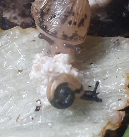 Bei der dunklen gehe ich stark von einem Baumschneckenbaby aus, da ich von jeder Art ein paar Eier zum Schlüpfen separiert hatte. Demnächst gibt es wieder Bilder.
