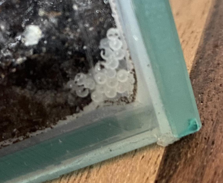 3. In dem kleinen Terrarium mit den Minis (Gehäuse zwischen 5-7 mm) finde ich immer wieder Eier! Die Minis werden doch wohl auch noch keine Eier legen? Beim ersten Gelege dachte ich noch, ich könnte sie mit dem Moos herein gebracht haben. Aber ich habe später in Abständen noch zweimal Eier beim Saubermachen gefunden ...