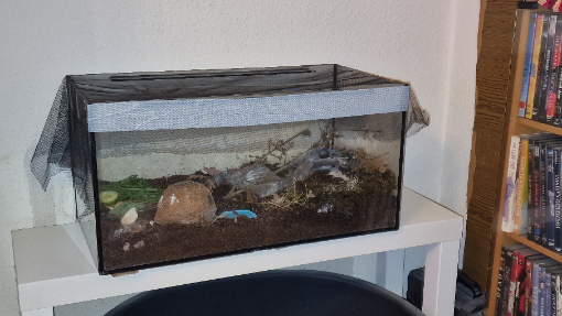 Der Deckel vom Terrarium ist leider komplett geschrottet und ich hab mich erstmal mit Fliegengitter beholfen.
