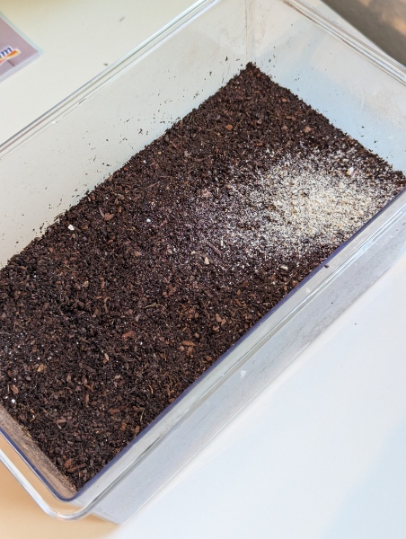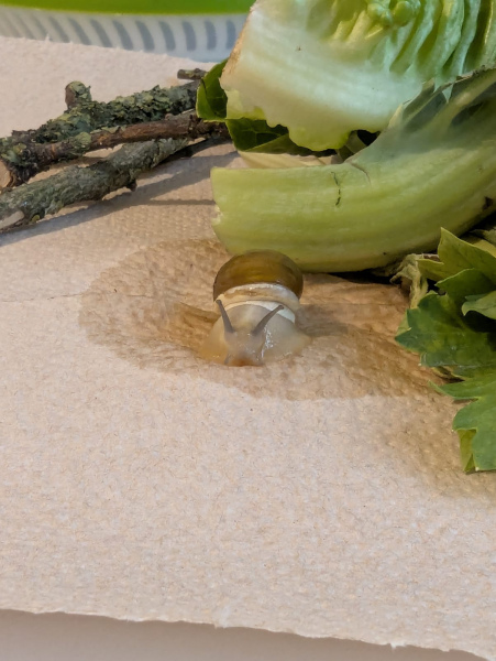 wir haben nun ein Habitat für die kleine hergestellt. Erde mit Kalk aufgewertet und ein wenig zusätzlich gestreut und schon durfte sie einziehen. Tatsächlich haben wir noch eine zweite Schnecke im nächsten Salat gefunden. Diese ist viel kleiner und hat sich direkt verschanzt. Habt ihr eine Idee, mit wem wir es hier zu tun haben?