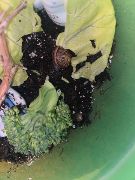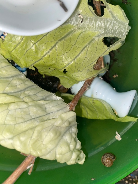 Zu den Schneckis: sie kamen in einer Kiste voller getrockneter Kräuter an. Freunde hatten im eigenen Harten Salbei zum trocknen hingehängt und uns vorbeigebracht. Die Schnecken waren also mindestens einen Monat schon ohne Feuchte und Futter. Wir bemerkten sie auch nur, weil sie durch das Trocknen wohl final von den Kräutern abfielen und in der Kiste landeten. Ich dachte auch sie seien tot, weil die ganz kleine sowie die mittlere halb transparent waren. Wir haben dennoch Wasser und Salat bereitgestellt. Nach einer halben Stunde waren alle drei wieder fröhlich am futtern. Gerade scheint es aber die ganz kleine (kleiner als der kleinste Fingernagel) es nicht geschafft zu haben - sie bewegt sich seit Tagen nicht mehr vom Fleck. Die anderen beiden sind aber fit und soweit auch vom Gehäuse fertig, wobei die mittlere noch leicht transparente Stellen aufweist.