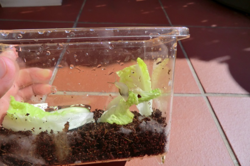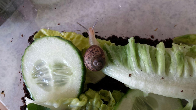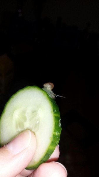 Schnecki klebte an der Unterseite einer Wasserflasche aus dem Wasserkasten, ich dachte, sie wäre tot. Dann hat sie sich aber wie wild auf das angebotene Wasser und Gurke gestürzt und seitdem ist sie hier.