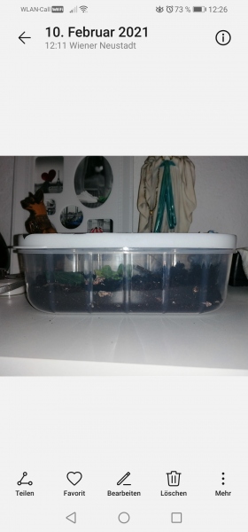 Ich habe in einen Becher von einem McDonalds-Eis feuchte Erde reingetan, den Deckel zerschnitten und Fliegenschutzgitter draufgeklebt und ihr ein Stück Erdbeere reingelegt.