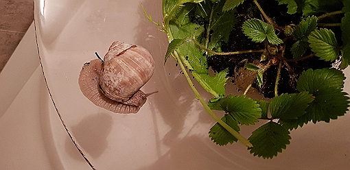 Gestern lag der "Deckel" im Moos, Schneckli ganz im Gehäuse eingemummelt. Daraufhin einen halben Gemüsestand (Tomaten, verschiedene Salate, Kräuter etc.) ins Glas gegeben.