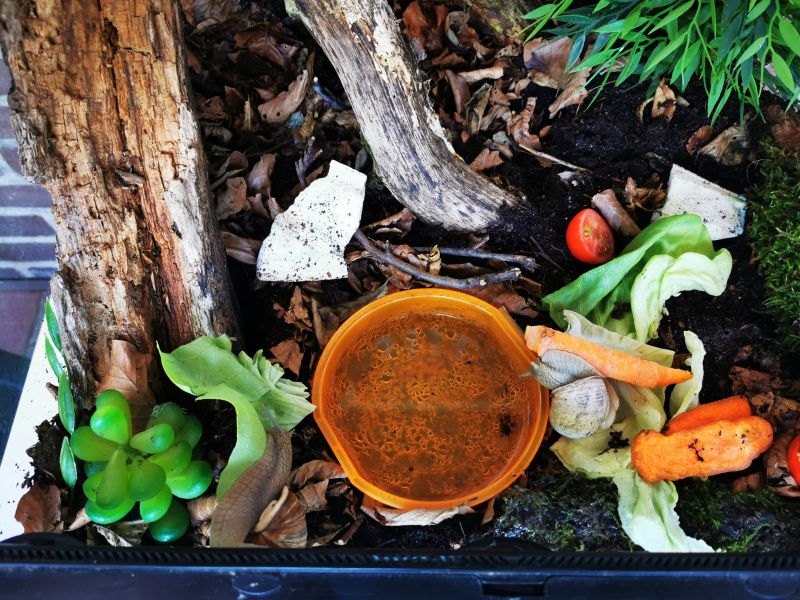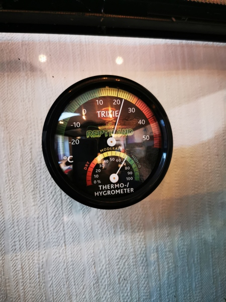 Das neue Zuhause ist ein 45er Exo Terra Würfel mit Kokoserde. Die Belüftung ist gut, Temperatur z. Zt. bei 23 Grad, Luftfeuchtigkeit liegt zwischen 50 u. 85 %. Ich habe ausprobiert ob sie es lieber etwas feuchter o trockener haben wollen. Ansonsten das was sie schon kennen im Terra, Kletteräste, Buchenlaub, Badeschale.