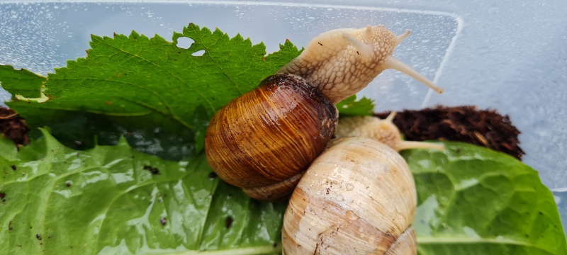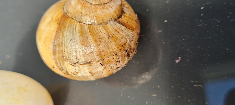 ich bin ganz neu hier und erst seit ca. 4 Wochen Schneckenbesitzerin von 6 Weinbergschnecken, die in einem Nagarium (Deckel mit Maschendraht) mit den Maßen 80 x 40 x 40 wohnen. In den letzten Tagen wurde es bei uns im Dachgeschoss wieder wärmer, wohl deshalb sind alle etwas inaktiv zur Zeit. 3 sind zur Zeit vergraben, 2 in Trockenruhe, nur die helle (deshalb "Waldgeist" genannt) lag halb zurückgezogen rum. Nun hat sie sich ganz ins Haus verkrochen.
