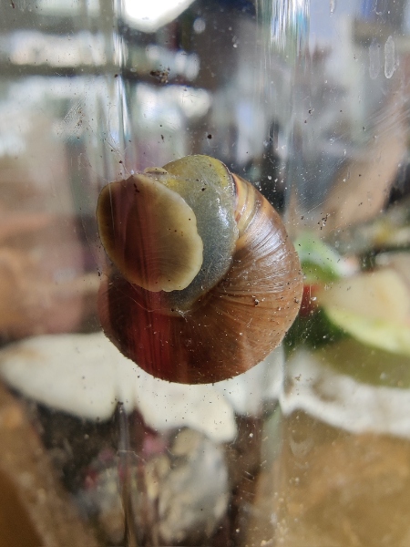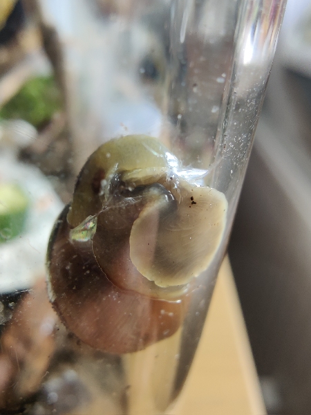 Die Schnecke klebt an der Scheibe und es sieht so aus als ob ihr Mantel herausquillt. Außerdem hat sie so eine Art durchsichtige Haut über der Öffnung angefangen zu bilden (denke ich zumindest).