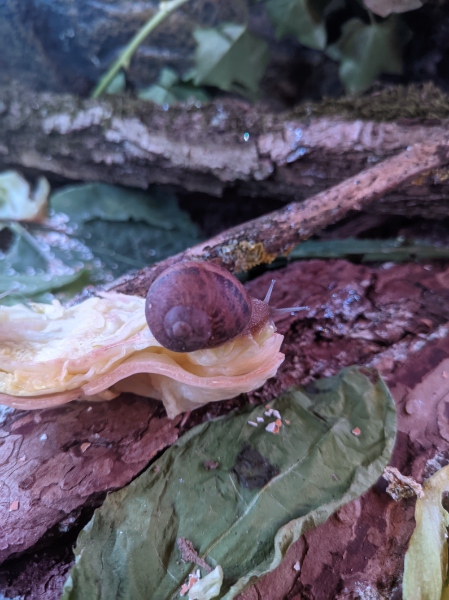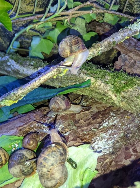 Zu futtern gibt es außerdem Eisbergsalat, Löwenzahn, Kohlblätter und bisher Gurke (was ich aber jetzt radikal reduziere, da sie nur noch Gurke gefressen haben). Ich habe gerade geguckt, am Futter von gestern waren sie soweit ich sehen kann nicht dran