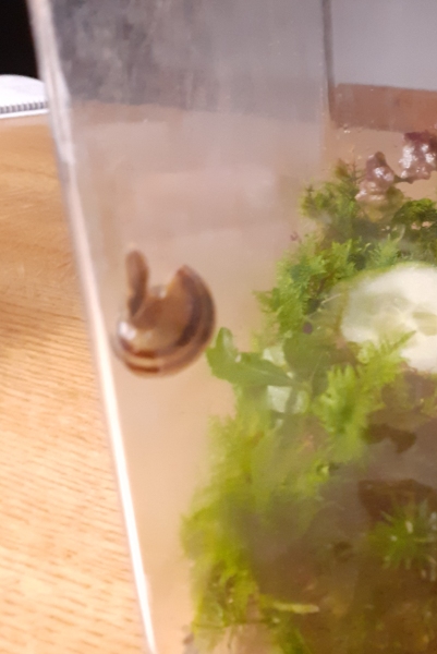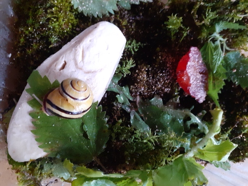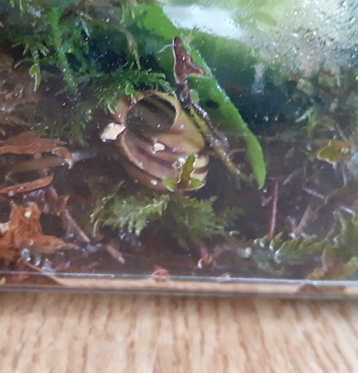 auf ansprühen reagierte sie auch gar nicht, daher hab sie ins feuchte Moos unter ein Buchenblatt gesetzt , und das Buchenblatt besprüht das es feucht war, nicht mehr die Schnecke selbst,und eines Abends ...tarraa....hab ich erst n Schreck gekriegt..sie war weg..dann hab ich mich beruhigt, sie konnte sich ja kaum in Luft aufgelöst haben, oder wurde von den anderen weggetragen