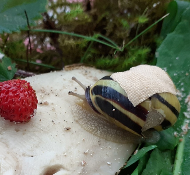 Sieglinde hat einen durchgehenden Riss längs durchs Häuschen und ich habe beobachtet, dass sich einen großen fehlenden Teil an der Unterseite relativ schnell verschlossen hat, der Rest durch ihre Turnübungen an der Decke, jedoch schief und krumm ist, so dass der Spalt immer noch offen ist. In meiner Unwissenheit habe ich ein Pflaster angebracht, welches ich mittlerweile einmal erneuert habe.