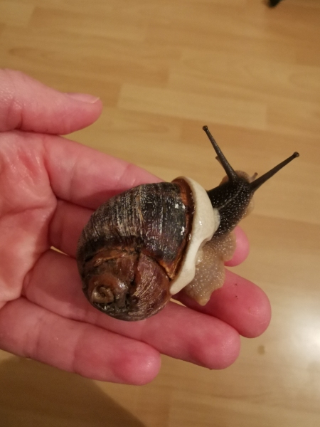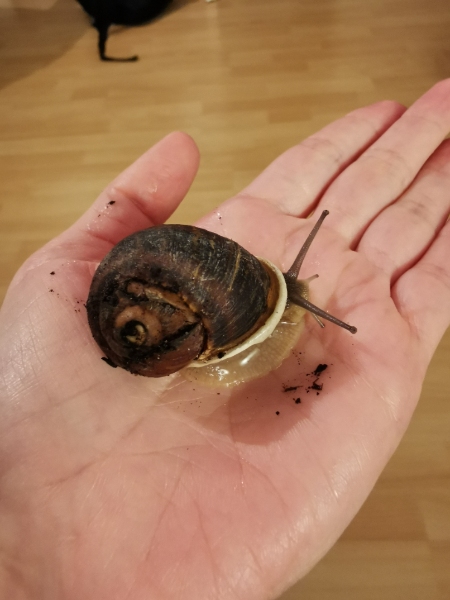 Im August habe ich dann noch eine Cornu Aspersum (ich denke zumindest dass es eine*ist) mit geplittertem Häuschen gefunden und sie zu meiner Helix dazu gesetzt. Ehrlich gesagt dachte ich sie* wäre auch eine junge Helix. Mittlerweile ist sie* gewachsen und ich denke sie* ist eine Cornu Aspersum. Eigentlich hatte ich gehofft beide vor dem Winter wieder aussetzen zu können, aber das Häuschen von Brunhilde (der Helix) ist noch etwas dünn und auch sehr unförmig.