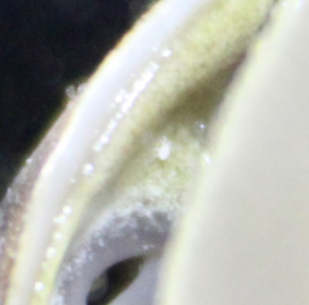 Sie hat letzte Nacht gut Gurke und Paprika gefuttert und sich dann ein Eckchen gesucht. Die Temperatur liegt laut dem Thermometer (im Terrarium) bei 20 °C, die Luftfeuchtigkeit schwankt zwischen 70 und 75%. Ich kann gerade keine Bewegungen sehen - weder Schnecke noch Punkte - aber es ist auch das erste Mal, dass sie nicht ganz im Häuschen ist...